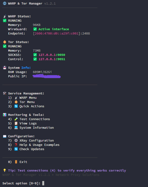 - Новая установка: “Start with WARP Menu (1) or Tor Menu (2)”